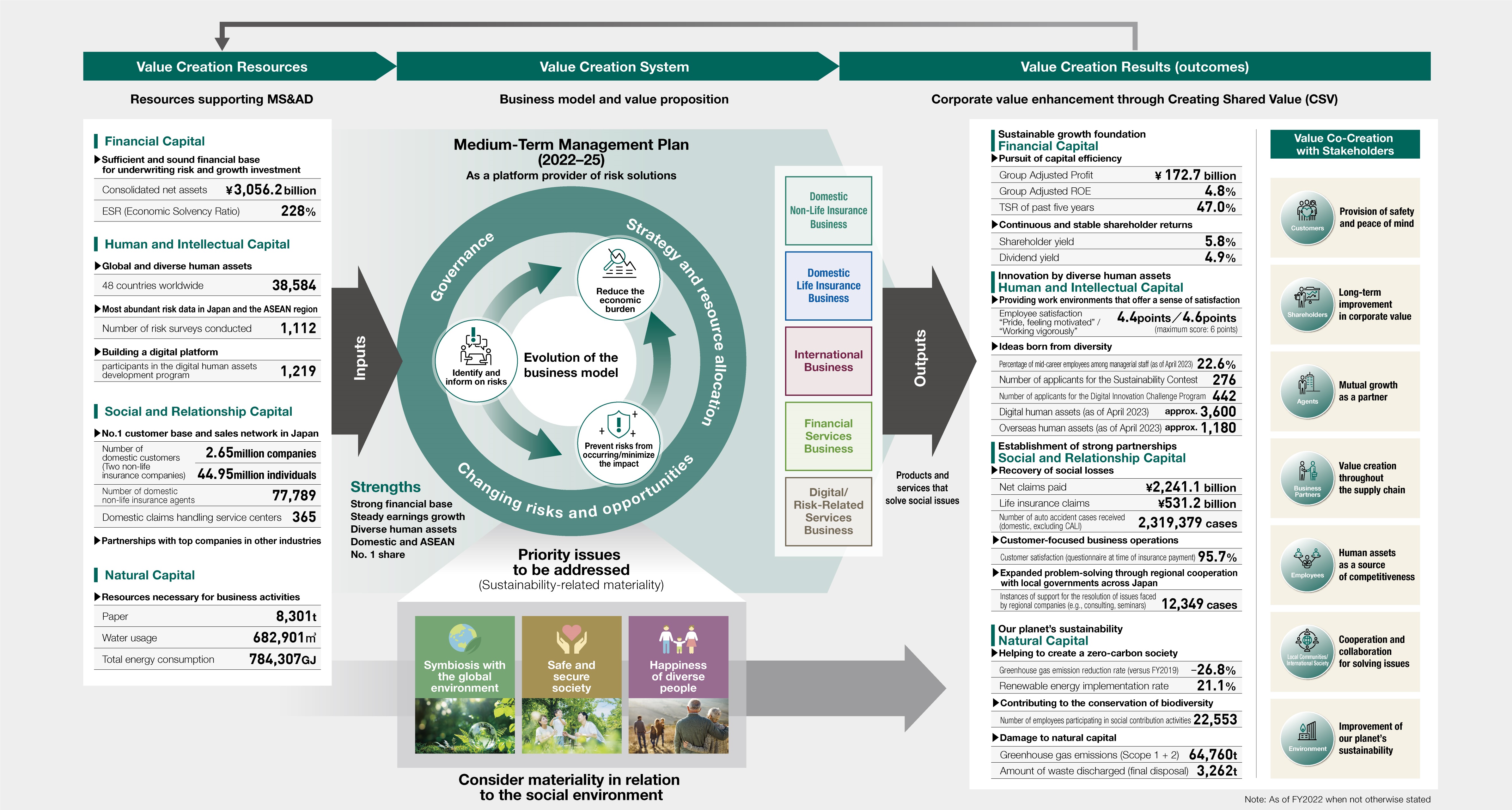 To realize our vision of society, we need to face those social issues that impede this vision and promptly identify various risks stemming from the issues. Then, through a variety of products and services, we need to prevent risks from occurring or minimize the impact of those risks and to reduce the economic burden when those risks materialize. By doing so, we help create an environment where customers can live and conduct business in a secure manner. That is our story of value creation.